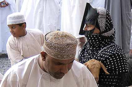 Der Viehmarkt in Nizwa lockt viele Touristen an, die Fotos von den Tieren und den Menschen schießen. So ergibt sich hier die Möglichkeit, erstmals auch die maskierten Frauen im Foto festzuhalten. Zwischen den weiß gekleideten Männern leuchten manchmal gelbe Kleider und rote Kopftücher bestimmter Stämme. Die Frauen geben hier auf dem Markt oft den Ton an. Sie begutachten die langhaarigen und kraushaarigen Ziegen oder führen sie sogar vor und verhandeln wegen des Preises. Nur wenige Kühe stehen zum Verkauf.