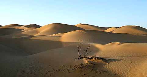 Etwa 40 km vor der Grenze beginnen die hohen Sanddünen des leeren Viertels, der Rub al Khali, in denen wir einen Übernachtungsplatz suchen. Die reizvollen Sandformen und -farben der Dünen, der Wellenschliff, die "Walleiber" und die runden "Brüste" entschädigen uns für die endlose Fahrt über die endlose Straße unter einem tiefblauen Himmel durch das reizlose, eintönige Land.