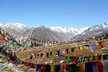 Um in das Tal des Spiti-Flusses zu kommen, der in südöstlicher Richtung verläuft, müssen wir eine steile Passstraße zum Kunzam-Pass (4.550 m) hinauf. Dort begrüßen uns nach 8 Stunden Fahrt gegen 16 Uhr die ersten buddhistischen Bauwerke mit flatternden Gebetsfahnen.