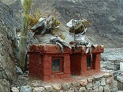 Hier im Nubra-Tal spüren die Menschen wohl noch sehr stark die Gefahren, die ihnen durch entfesselte Naturgewalten drohen. Wir denken an die Bergrutsche in den Alpen, die jedes Jahr einige Dörfer zerstören. Deshalb stehen überall, auch auf den Häusern, die roten Büschelaltäre, die die Naturgötter beruhigen sollen. Früher färbte das Blut der Opfertiere die Steine und die Türpfosten rot, heute ist es nur eine Farbe. Häufig stehen zwei Steine gegeneinander gelehnt oder liegen übereinander. Auch die vielen Manimauern in den Siedlungen zeigen die Angst vor den Gefahren der Natur.