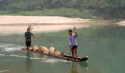 Nachdem die Garo zum Christentum übergetreten sind, gibt es kaum noch traditionelle Rituale. Nur nach längerem Suchen finden wir noch Anhänger der alten Religion und Kultur. Mit einem Kohlekahn, aus dem immer wieder das eindringende Wasser geschöpft wird, tuckern wir zwischen den Untiefen, Felsen und den Fischreusen den Simsang herunter. Sandbänke, hoch aufragende Felswände und dichter Urwald begleiten uns. Affen suchen am Ufer nach Essbarem, Eisvögel warten auf Fischschwärme und manchmal sollen auch Elefanten aus dem Wald ans Ufer kommen.