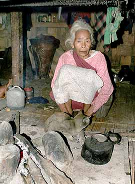 Alle Erwachsenen sind auf dem Wochenmarkt. Nach dreistündigem Warten erscheinen endlich die ersten Erwachsenen, auch unsere Informantin, die letzte Animistin. In ihrem traditionellen Bambushaus hängen Knochen ihrer Opfertiere und Zeremonialtrommeln. Sie möchte wie ihre beiden Männer, die nach altem Brauch verbrannt wurden, auch auf dem Verbrennungsplatz im Wald verbrannt werden und nicht wie ein Christ begraben werden. Die drei Zeremonialtrommeln sollen dabei wie üblich die Prozession mit dem Schamanen und den Dorfbewohnern begleiten. Damit die Vorfahren einen Verstorbenen freundlich in ihrem Aufenthaltsort in den Bergen aufnehmen, ziehen alle Beteiligten besondere Kleider an und beten, singen und tanzen auf dem Weg in den Wald. Dort werden ebenfalls alle privaten Gebrauchsgegenstände wie Kleider, Töpfe, Regenschirm u.ä. verbrannt.